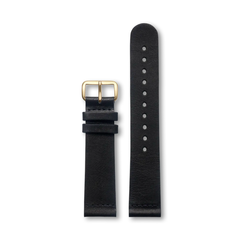 A 20mm classic two piece black Italian leather strap, finished with a stainless steel buckle with gold plating.