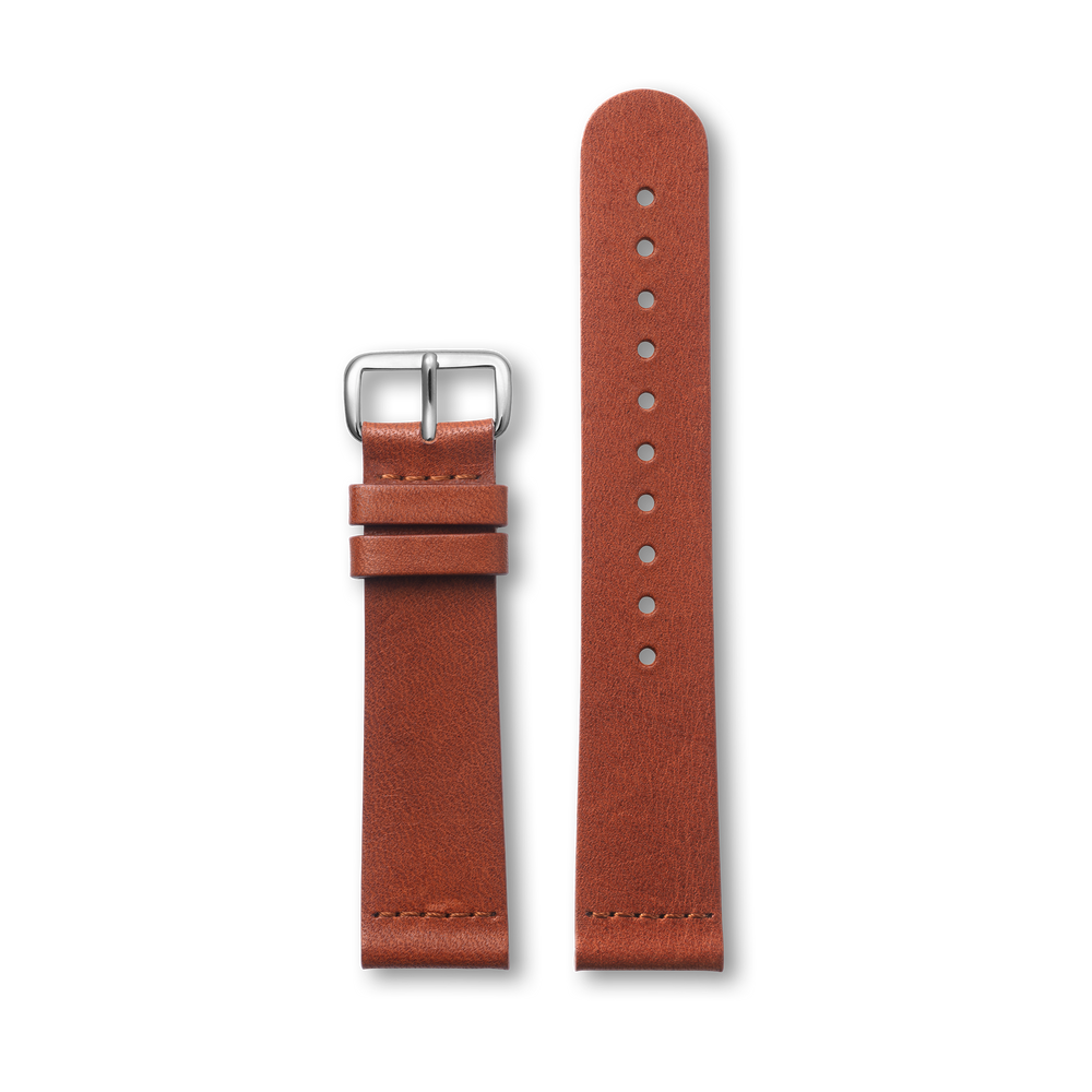 A 20mm classic two piece brown leather strap, finished with a polished silver buckle.