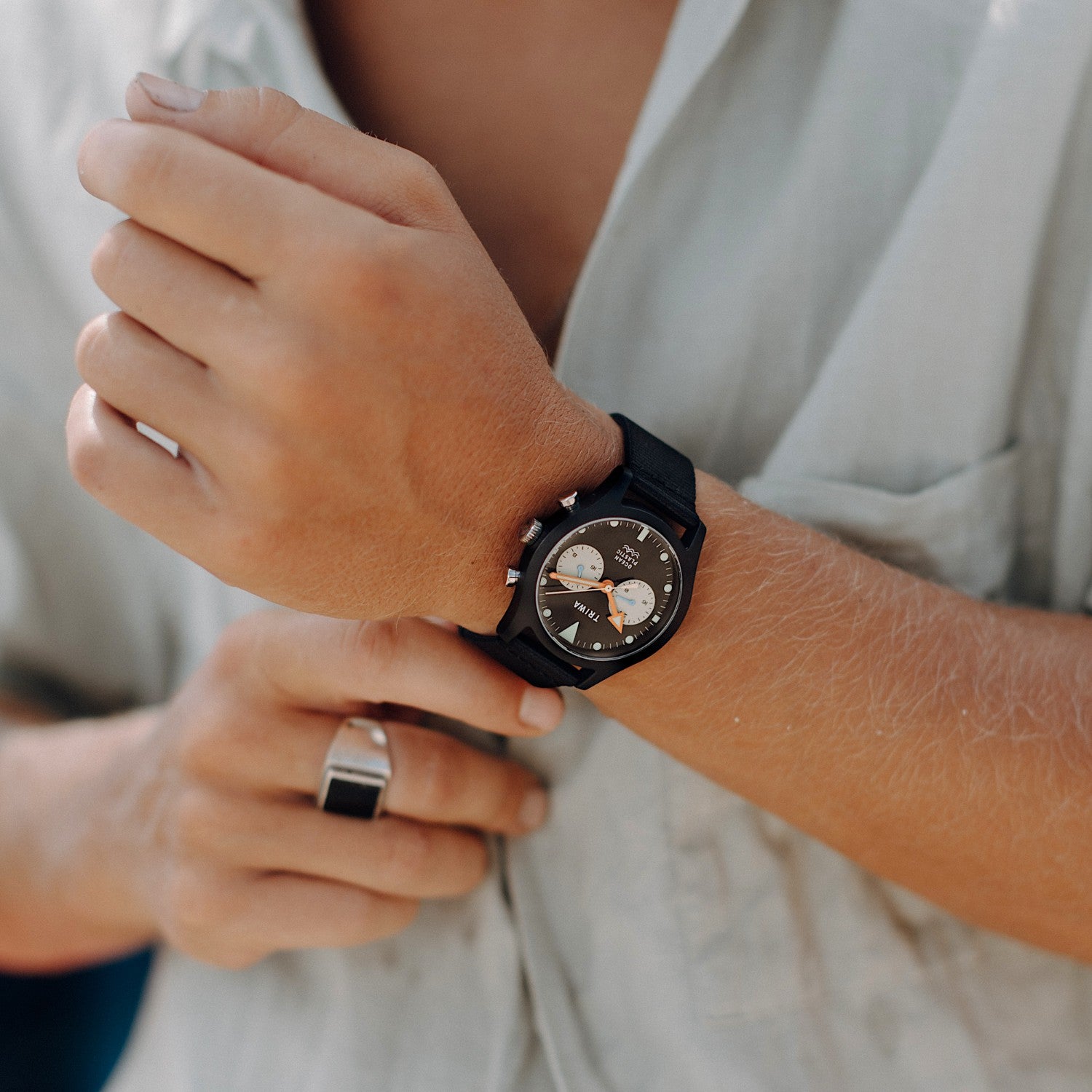 The Ocean Timer case and strap is forged out of ocean bound plastic. This is plastic waste collected by the shorelines before it gets the chance to enter the ocean.