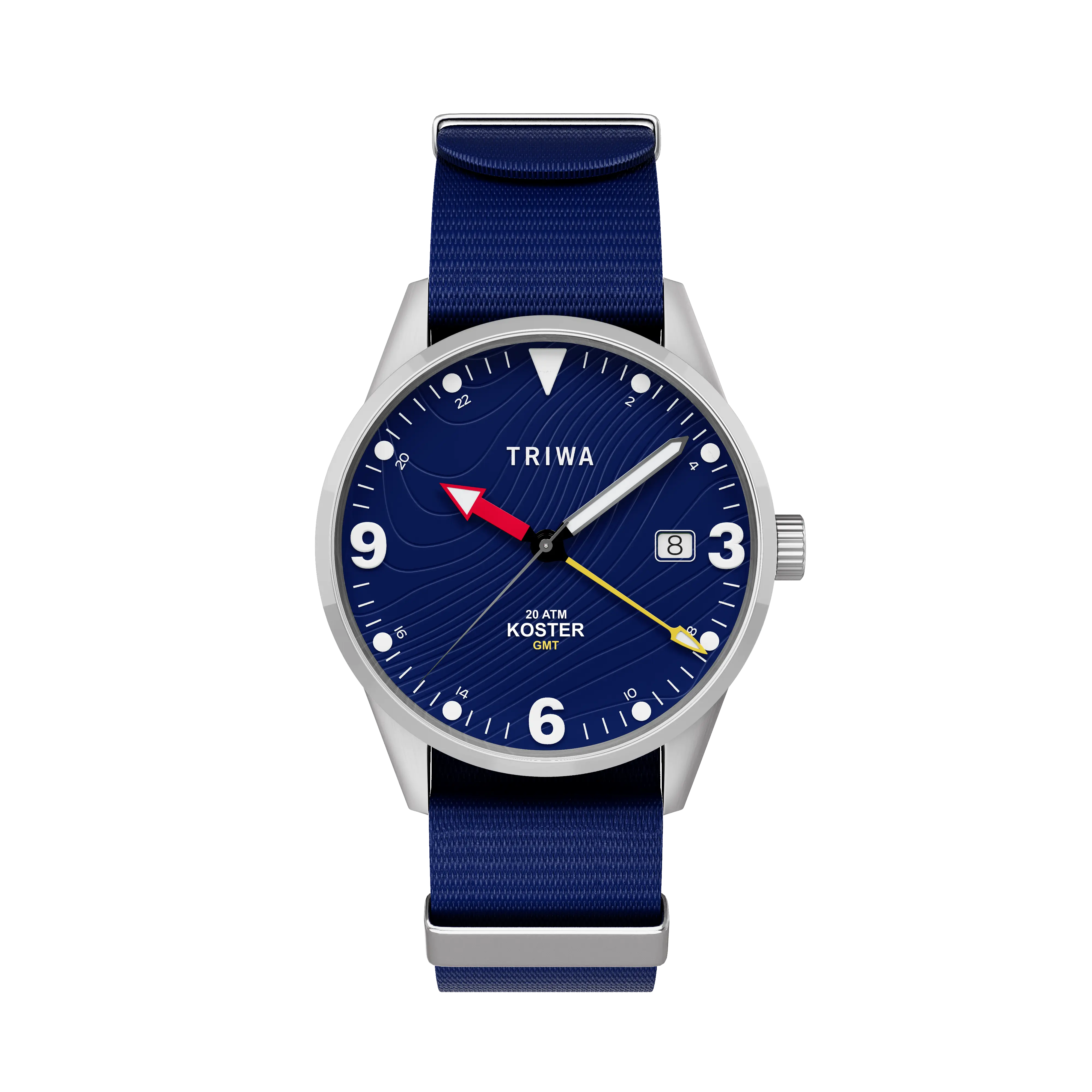 Melded into this vibrant landscape is a classic diver index design, accented by subtle GMT numbers positioned near each indice. Its printed super-lume index ensures longevity and readiness to withstand any shock or darkness encountered on your ventures. The electrically-colored, diver-styled hands burst from the dial's surface, injecting raw energy and life into the entire piece.